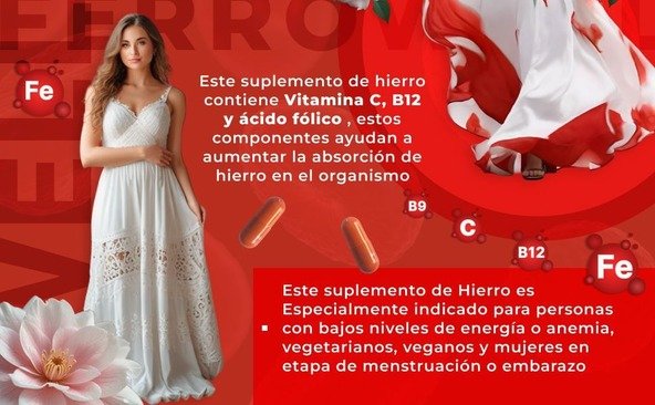 - Deficiencia o afecciones con mayores requerimientos de hierro junto con tres vitaminas: vitamina C, vitamina D y ácido fólico (p. ej., anemia, embarazo, mala alimentación y recuperación de cirugía).