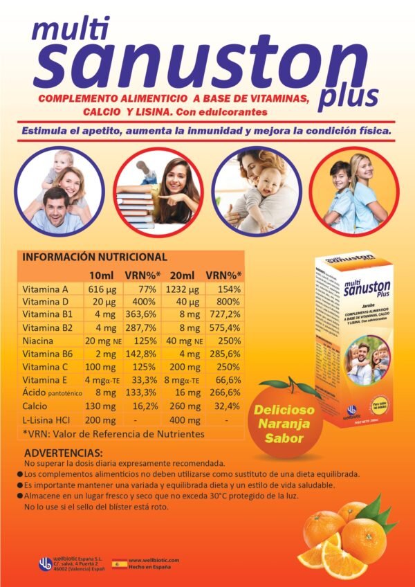 Como el cuerpo no puede producir vitaminas por sí solo, incorporar un complemento alimenticio diario adecuado es esencial en todas las etapas de la vida. Multi Sanustone Plus ofrece vitaminas esenciales para potenciar la energía, la concentración y el bienestar general, todo con un delicioso sabor natural a naranja, que encanta tanto a niños como a adultos.
